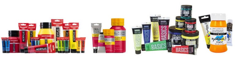 Studiekwaliteit acrylverf van links naar rechts: Amsterdam Standard, Galeria (Winsor and Newton), Liquitex Basics en Daler Rowney System 3