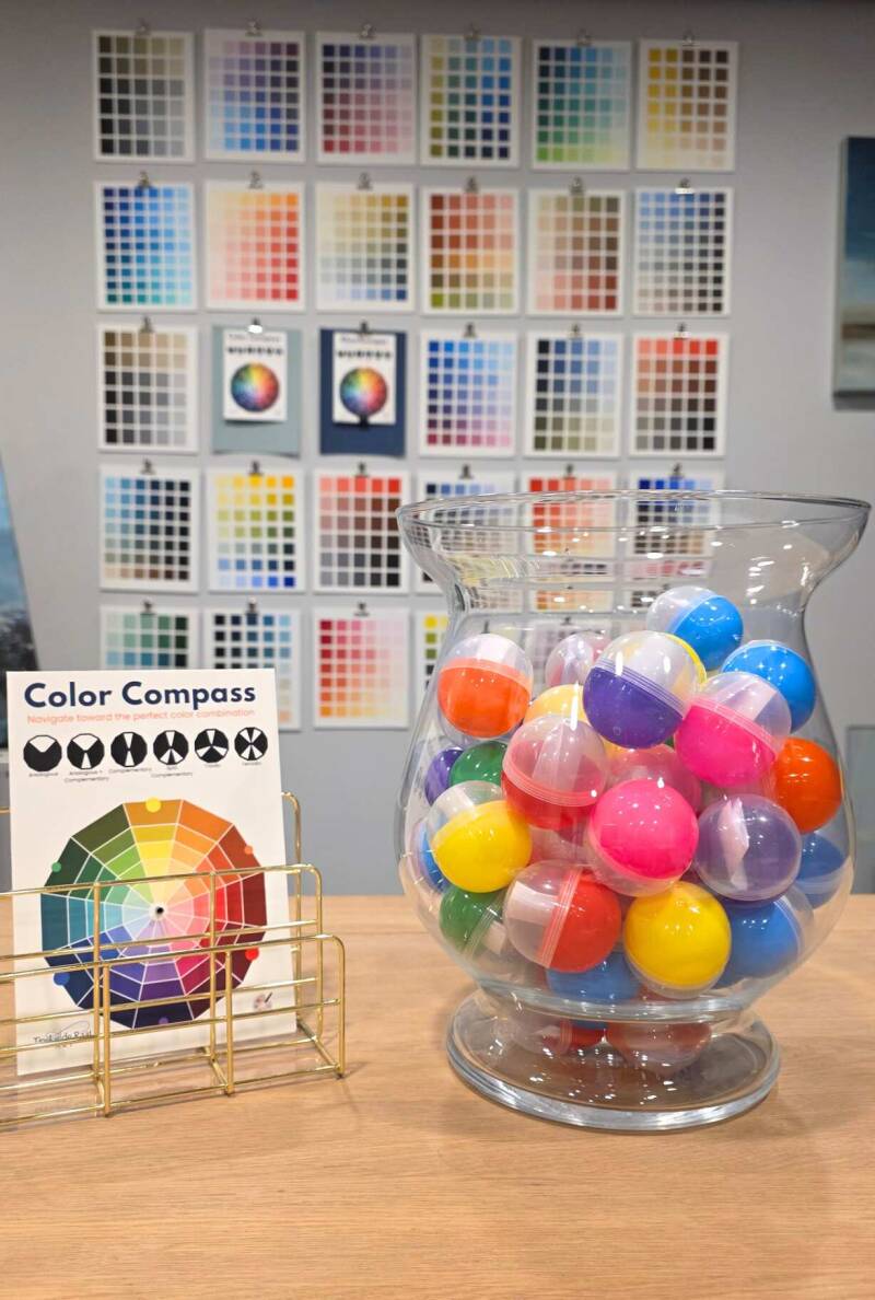 Op die kaartjes staan foto’s die speciaal zijn uitgezocht bij het KleurKompas en een kleurenschema laten zien. Dat is natuurlijk maar één mogelijke combinatie. Van elk kleurenschema kun je eindeloos variëren. Maar zo heb je in ieder geval een goed voorbeeld hoe de kleuren met elkaar samenwerken en wat voor effect dat geeft.