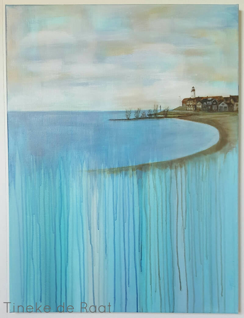 Geschilderd met grove penseelstreken en paletmes wat veel structuur geeft.  Acryl op canvas 70 x 50 x 4 cm. (Verkocht)